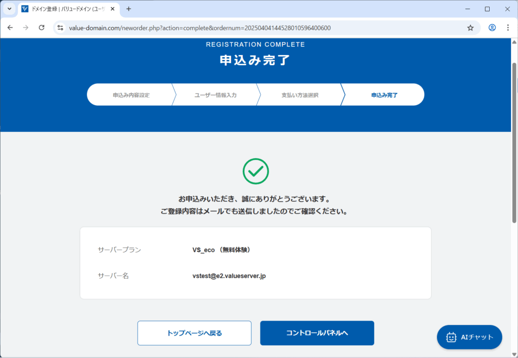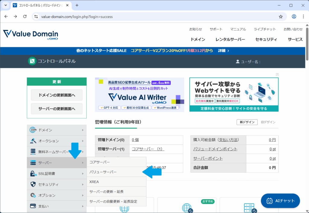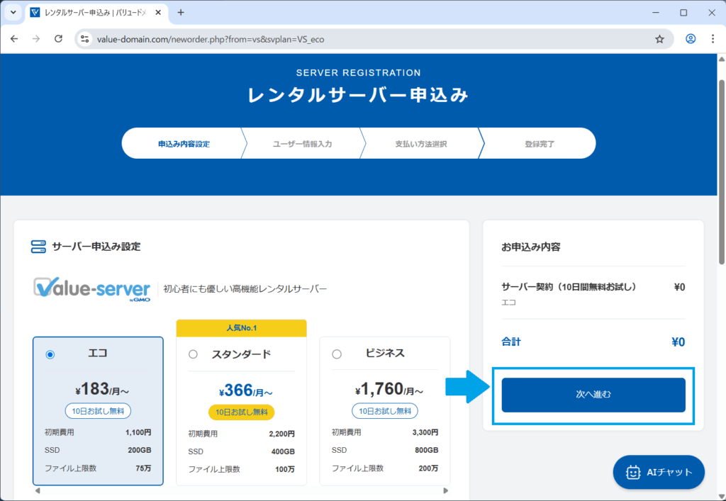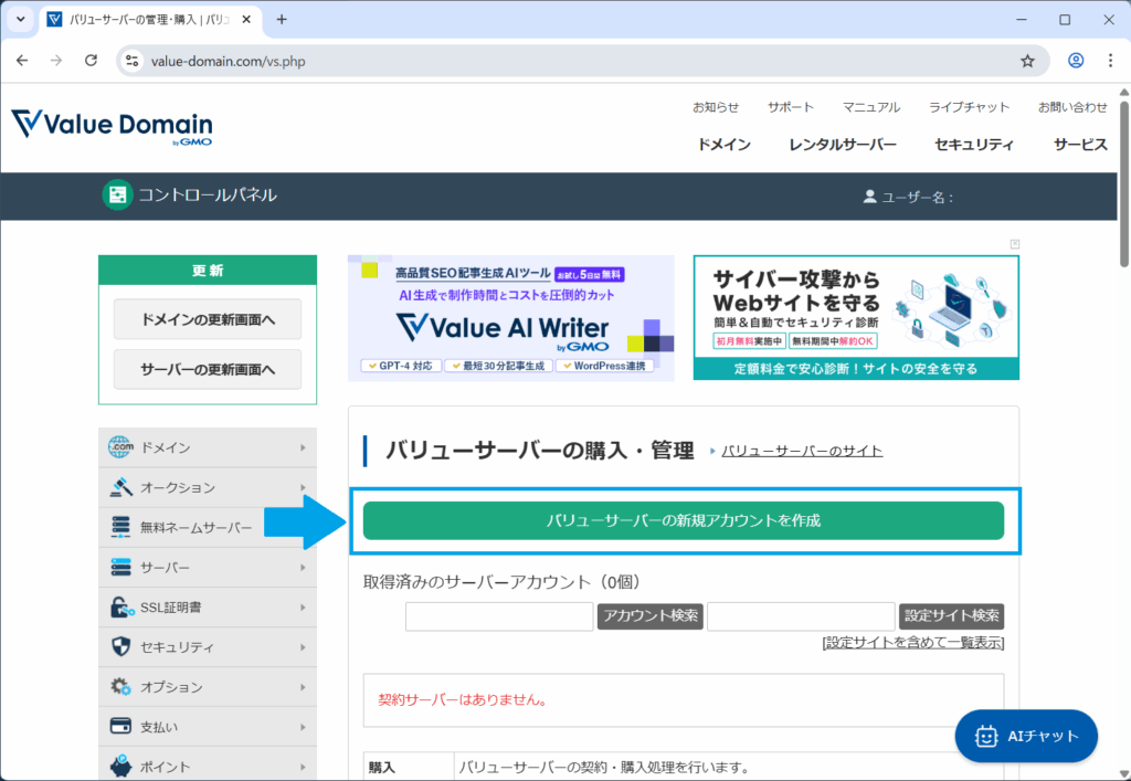 バリューサーバーの無料お試し(10日間)終了後以降も引き続き利用するには、サーバーの本契約(購入)手続きが必要です。