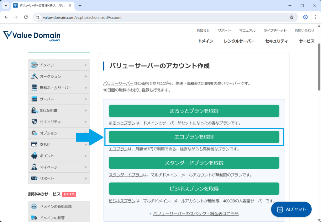 お試し期間中、もしくは終了後すぐに、バリュードメインのコントロールパネルで、該当サーバーアカウントの横にある「購入」ボタンを押してください。