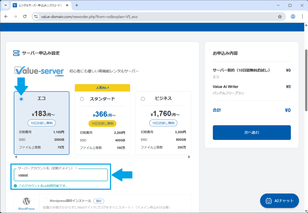希望のプランが選択されていることを確認し、「サーバーアカウント名(初期ドメイン)」を設定します。