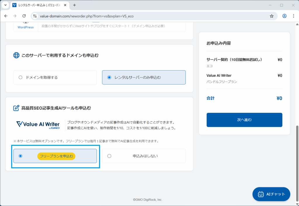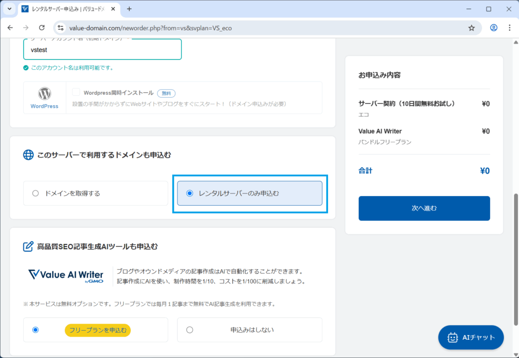 今回はサーバーに付属している初期ドメインを使うので、「レンタルサーバーのみ申込む」を選択します。