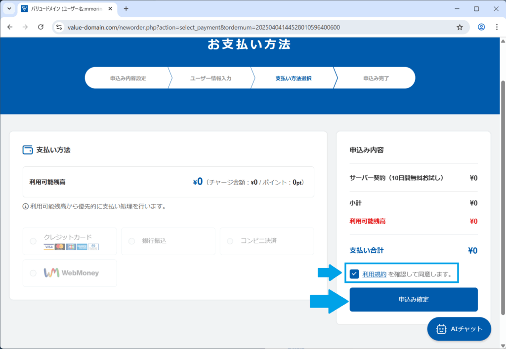 申込み内容に間違いがなければ、「利用規約 を確認して同意します。」にチェックを入れ、「申込み確定」をクリックします。