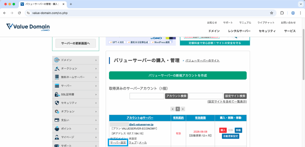 取得済みのバリューサーバー一覧が表示されるので、取得したバリューサーバーの「サーバー設定」をクリックするとサーバーにログインできます。
