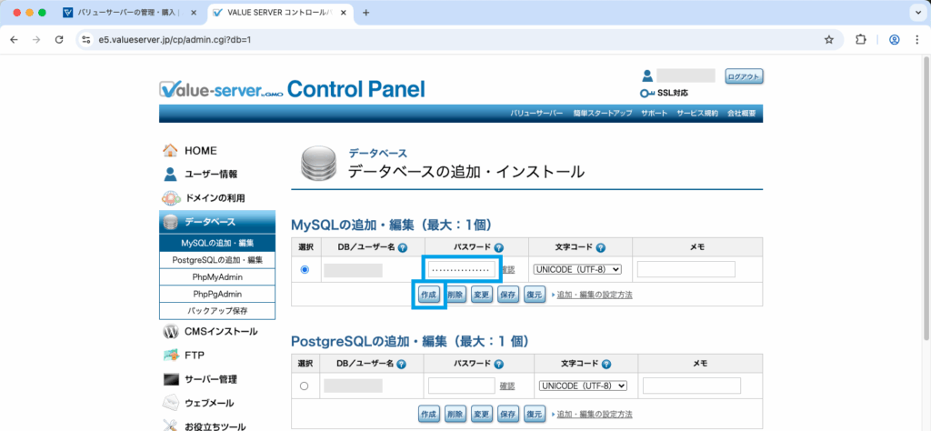 「MySQLの追加・編集」の「選択」のラジオボタン(〇マーク)をクリックし、パスワードを入力し、「作成」ボタンをクリックします。