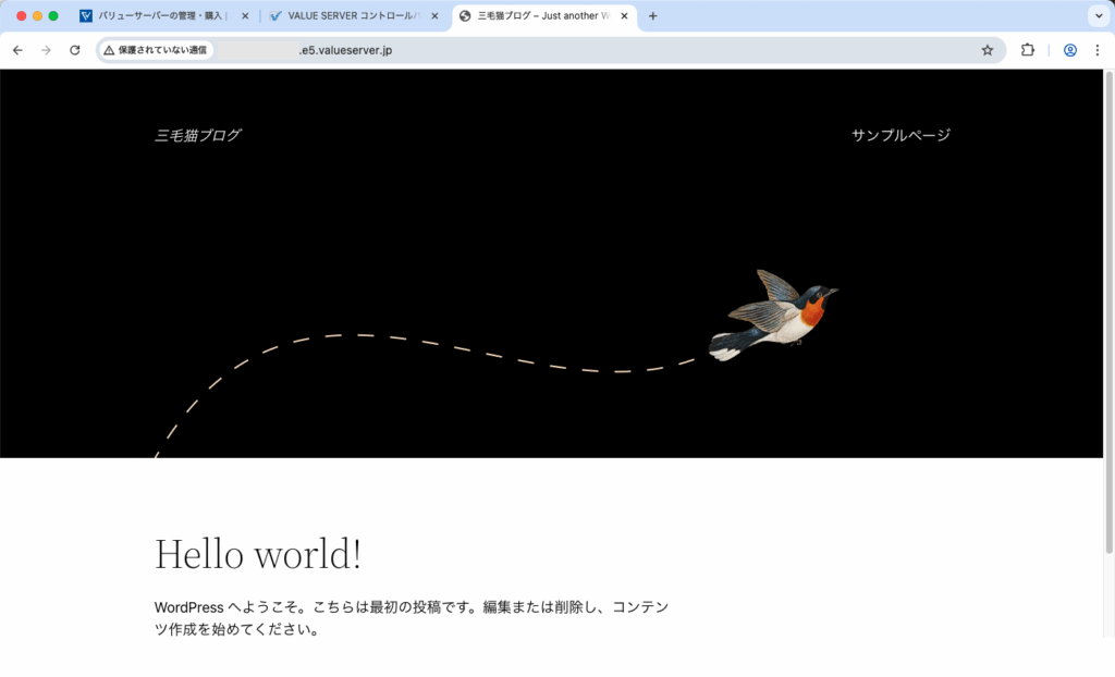 WordPressをインストールしたURLへアクセスすると、WordPressのサンプルページが表示されます。