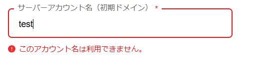 すでに使われているサーバーアカウント名は利用できませんが、利用できないときは自動的にチェックして、下記のようにお知らせしてくれます。
